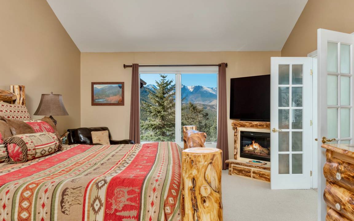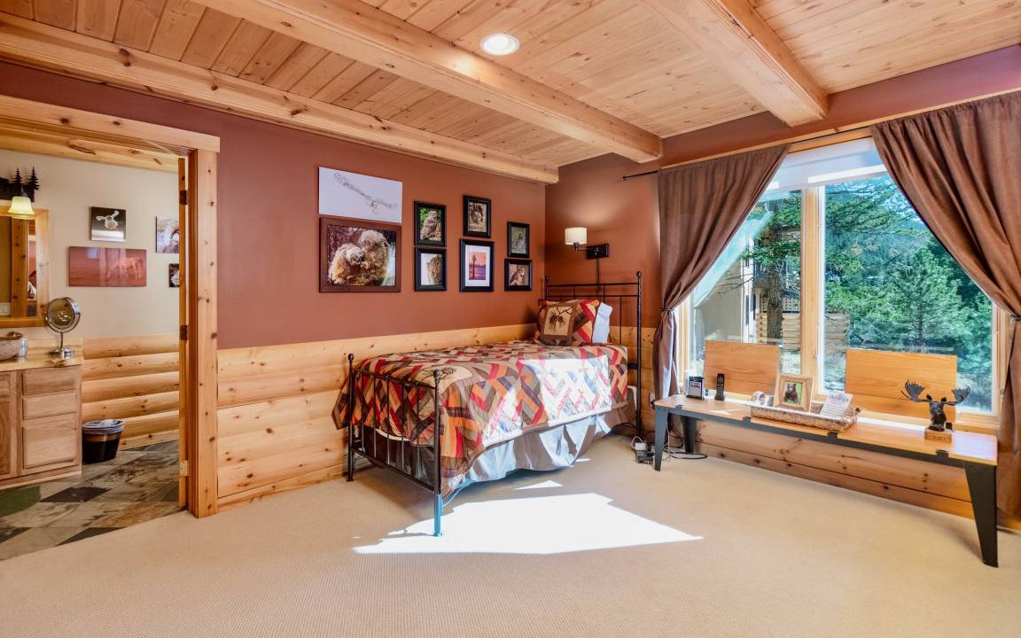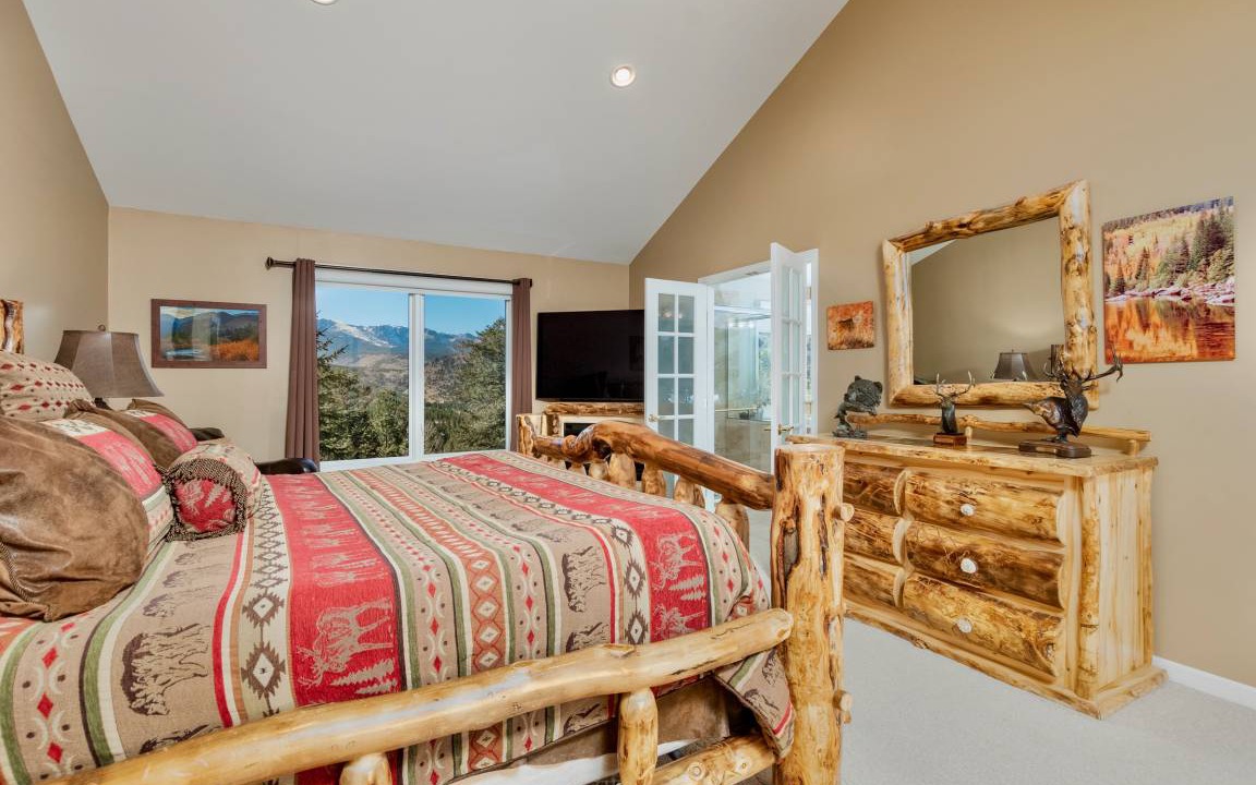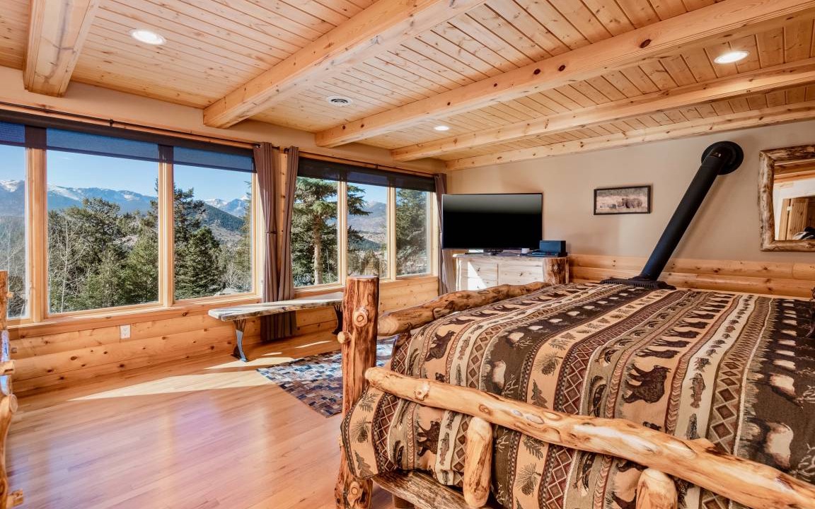 Downstairs boasts an additional king guest suite featuring floor to ceiling windows overlooking Rocky Mountain National Park, another handcrafted king-size bed, a wood-burning fireplace, and a flat screen television with its own Blu-ray player and Xbox. The wooden ceiling and beams in this bedroom radiate grandeur and opulence. Larger families will appreciate the additional twin-size trundle bed in this oversized bedroom.