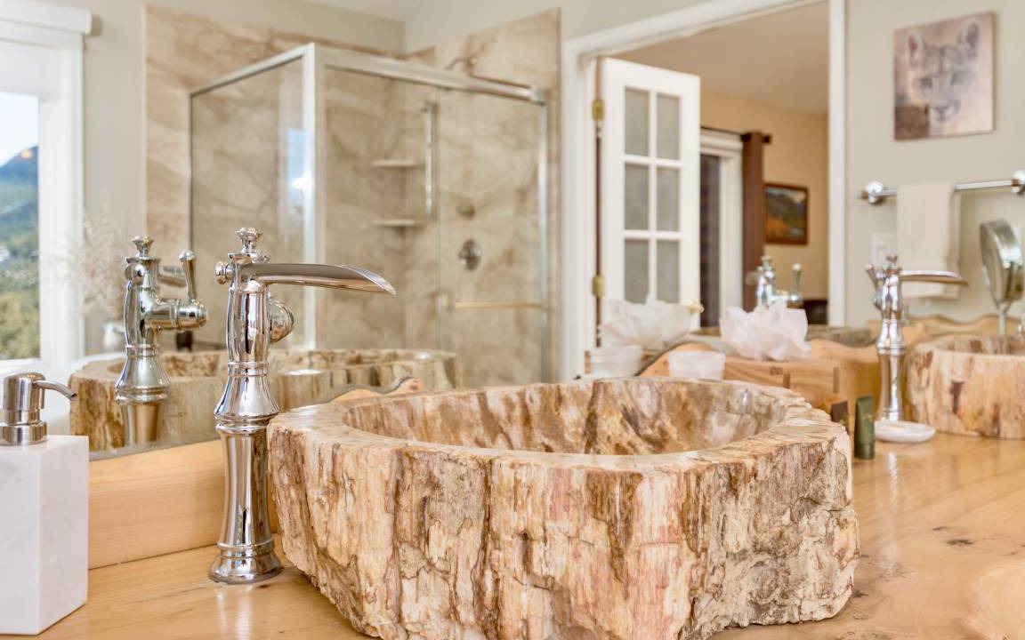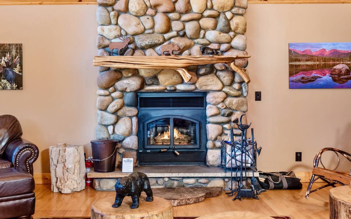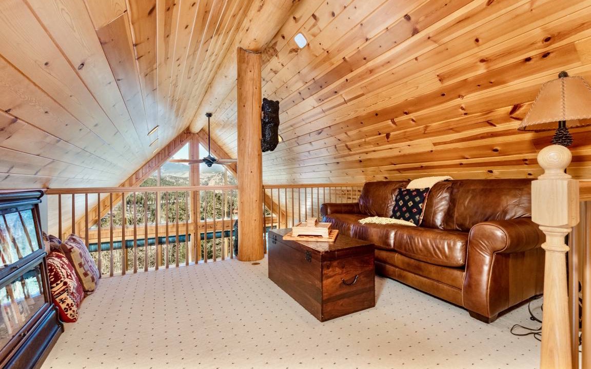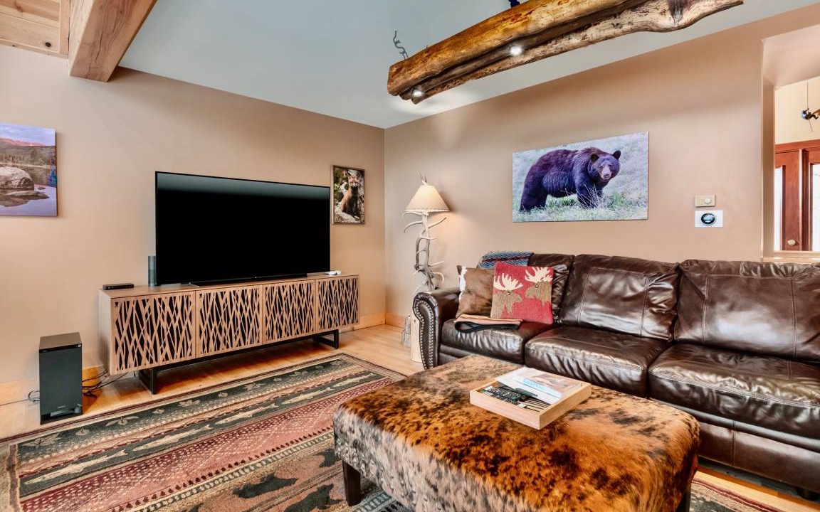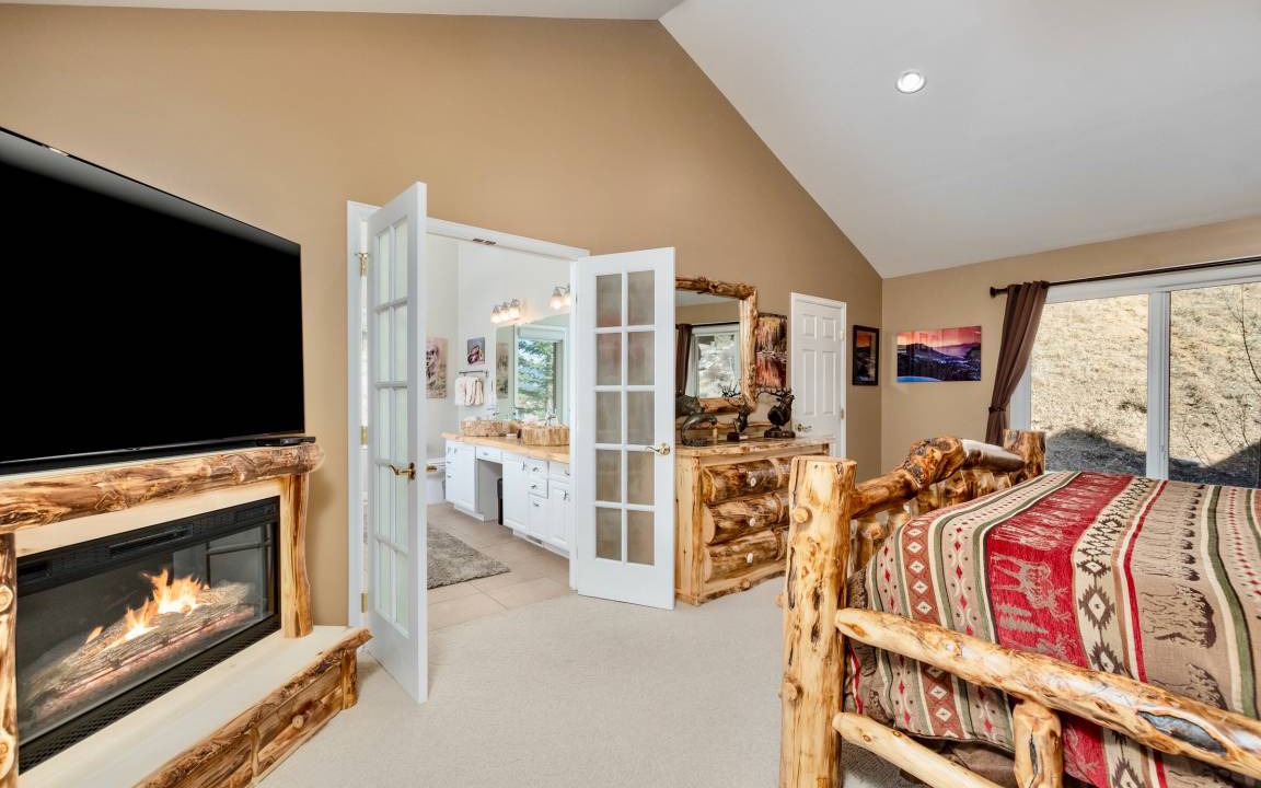 Downstairs boasts an additional king guest suite featuring floor to ceiling windows overlooking Rocky Mountain National Park, another handcrafted king-size bed, a wood-burning fireplace, and a flat screen television with its own Blu-ray player and Xbox. The wooden ceiling and beams in this bedroom radiate grandeur and opulence. Larger families will appreciate the additional twin-size trundle bed in this oversized bedroom.