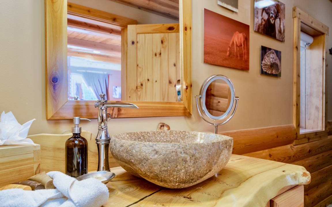 Awestruck features a private, top-of-the-line 7-person hot tub, two romantic wood-burning fireplaces, jetted soaking tub, fully stocked complete kitchen with stainless appliances, expansive deck with a handcrafted log picnic table and Weber gas grill, multiple flat screen televisions, Blu-ray players, Xbox, free wireless Internet and telephone services, private laundry room with full-size washer and dryer and attached two car garage. The living quarters offer one bedroom with a king-size bed, a second bedroom with a king-size bed and a twin-size trundle bed, and a third bedroom with two twin-size beds.