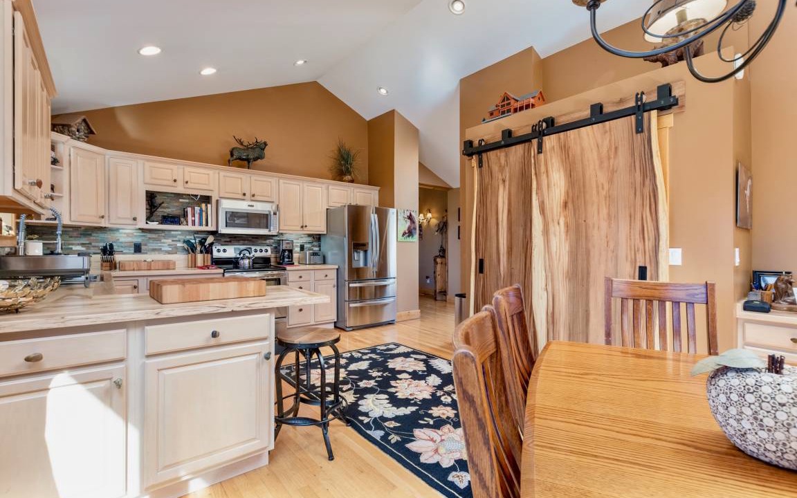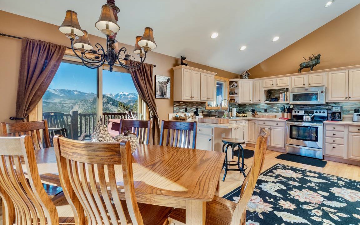 The kitchen provides stunning views of Rocky Mountain National Park, with a handcrafted Amish wooden kitchen table as its centerpiece. You'll comfortably be able to dine with up to 10 of your family members, friends, and loved ones. This fully furnished cook's dream is adorned with hickory wood counters, stainless kitchen appliances, and a complete array of kitchen utensils, bakeware, and cookware. To top it all off -- you'll also discover a coffee bar and wine bar -- for libations and conversation in the morning, afternoon, and evening.