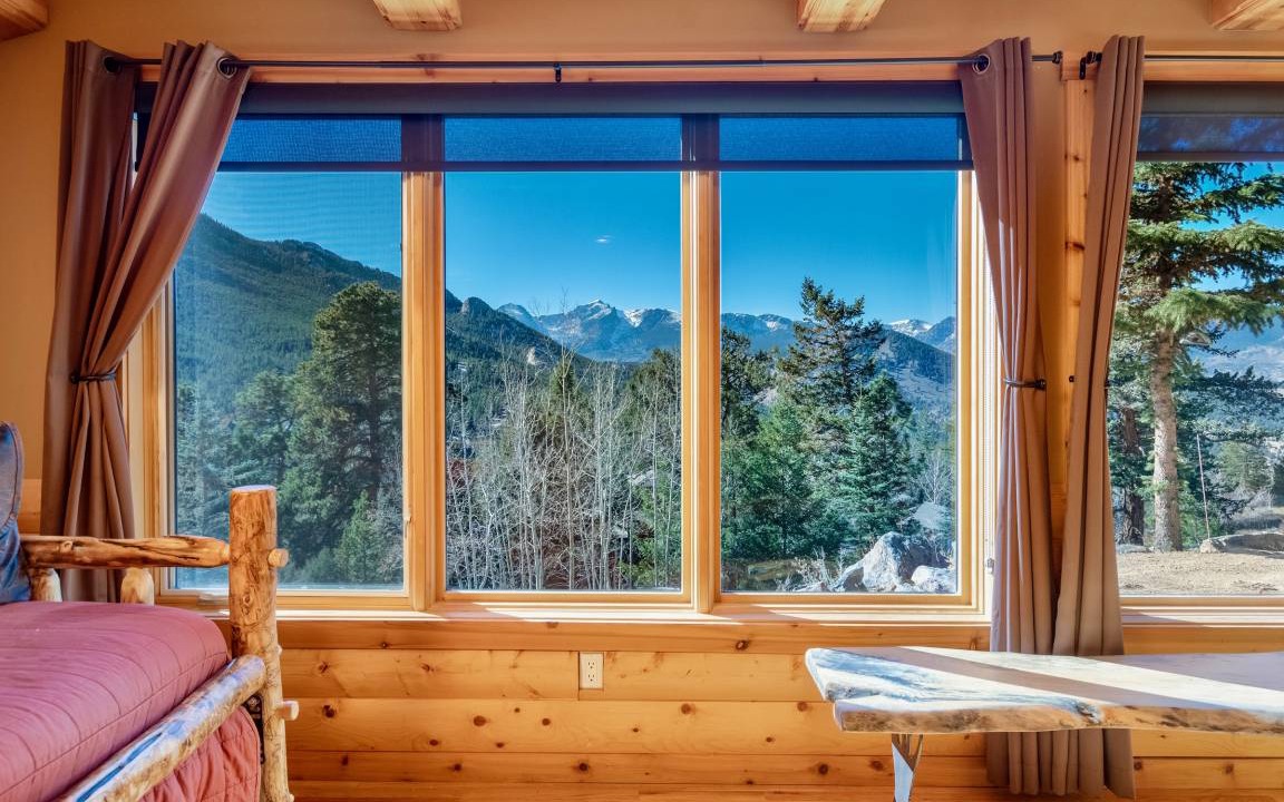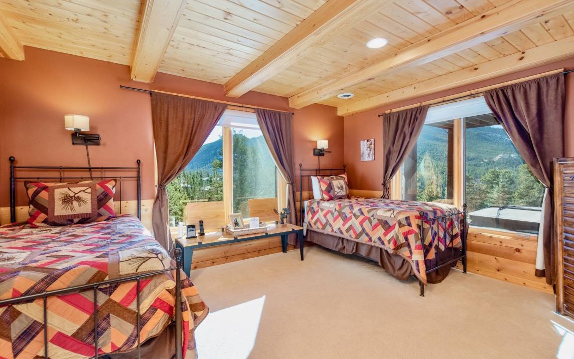 Awestruck's third bedroom features two twin-size beds, views of Rocky Mountain National Park, a flat screen television, wooden ceiling and beams, and its own entrance to a full bathroom.