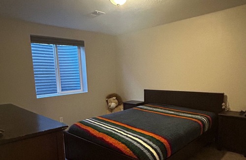 Furnishings include: king bed, 2 dressers and 2 nightstands in master, bunkbed with full bed on bottom and twin bed on top and dresser in second upstairs room. The basement has 2 additional rooms with a queen bed and dresser in each room. Basement living room also has a fold out couch that could sleep 2 additional people. Living room set up includes couch and entertainment center with smart tv. Kitchen includes dining room table with 6 chairs and basic kitchenware. Open room in finished basement includes a child play area with toys. Home has a huge backyard that includes trampoline with enclosure and a wooden playset. Full access to property with the exception of the garage.