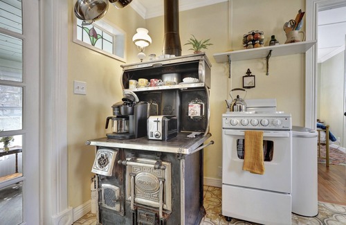 Please note, the Cottage is full of character. Doors require a special pull or push, and each heater has its own thermostat. The vintage kitchen is without a dishwasher, and the stove is slightly smaller than modern standards. The original wood-burning stove, stamped 1896, serves as a unique breakfast bar. Pets and children are welcome, but be mindful of antique furnishings and the original glass windows.