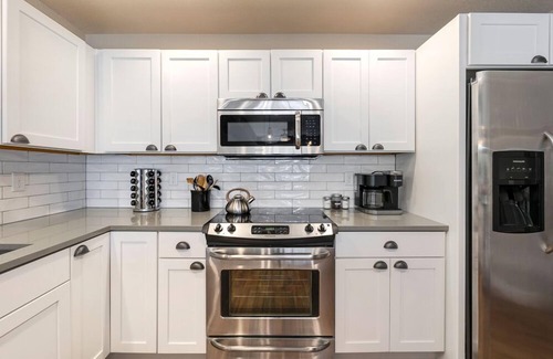 KITCHEN: Fully equipped kitchen with stainless steel appliances, microwave, cooking basics, dishware/flatware, spices, complimentary coffee, creamer, tea and sweetener