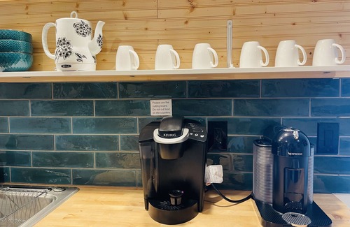 We provide a few snacks, like popcorn and chips. I also have a Keurig, Nespresso, electric hot water kettle, tea, coffee and creamer. For the two coffee machines, you will find coffee and/or espresso in the white cabinet. We use refillable pods to cut down on waste from disposable ones, but we may have a few disposable ones available, too, for your convenience. Feel free to bring your own pods for these machines if you would like.