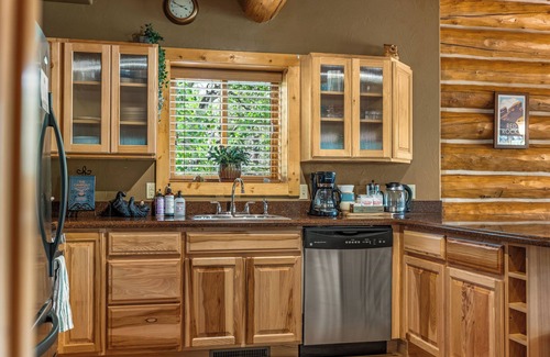 Welcome to your mountain oasis at Bailey Bear Haus! At this beautifully-crafted modern log cabin, you'll have a relaxing and cozy stay. Upon entering, you’ll be greeted by a large great room with vaulted ceilings and a view of the mountains.