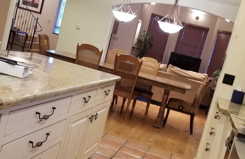 Master bath has extra large walk in granite shower and garden tub. There is also a large walk in closet and mini fridge stocked with water. Bedroom two has two queen beds and a Jack and Jill bath with bedroom three which has a single queen bed and rocking chair. Bedroom three has three twin size beds and bathroom. We provide plenty of towels and all beds have lots of pillows, pristine white sheets and comforters. Downstairs there is a laundry room with washer and dryer, a bonus room with couch and recliner and a half bath.