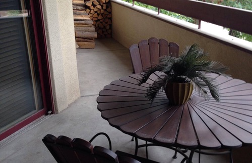 The unit offers a full kitchen, so that you do not have to eat-out for every meal. It has a wood-burning fireplace, washer-dryer unit, 2 bedrooms and 3 full bathrooms. The living room also has a pull-out sleeper sofa for additional guests. There is a balcony with a great view of the town and the mountains behind it.