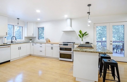The newly remodeled home features 5 bedrooms, 3 bathrooms, kitchen, dining room, living room, sunporch, family room, garage space filled with games (including classic arcade games, pingpong, frisbee golf, basketball) an indoor climbing wall, and outdoor living spaces. Every area of the home has plenty of seating, curious artwork and lots of fun touches to make your stay here memorable.