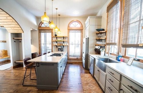 Master bedroom downstairs, 3 bedrooms upstairs, plus 3 full and 2 half baths. Every room has queen or king beds, all with Westin Heavenly mattresses, 100% cotton sheets and down duvets and pillows. Home can sleep up to 11 people (or 12 if small kids). Amazing patio space with outdoor fireplace and gas grill. This is truly the nicest home in South Main. Just 2 blocks from the Surf hotel and river.