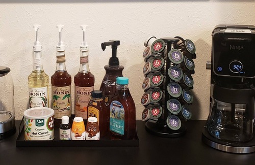 Coffee / tea bar: Pods & grounds, regular & decaf, wide tea variety. Ninja dual brew machine (pods & 12-cup drip), French Press, electric tea kettle. Variety of syrups & sweeteners.