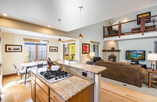 Two bedrooms are on the main floor. One features a King bed, large closet and attached bathroom with double vanity and tub/shower combo. The other bedroom has a Queen bed and large closet with access to a full bathroom in the hallway with walk-in shower. You will find a full size washer and dryer in the hallway closet. Head upstairs for the open loft with desk and seating area, the perfect place to catch up on some work or read a book. The upstairs bedroom has a Queen bed and bathroom with walk-in shower.