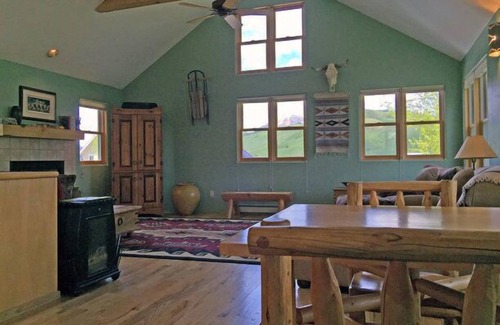 One of Crested Butte’s best houses for family gatherings, located on the north edge of town near the creek and the center of downtown, with great views of Mt. Crested Butte and the Maroon Bells. The house features comfortable, contemporary southwestern decor and handmade pine and aspen log furnishings.