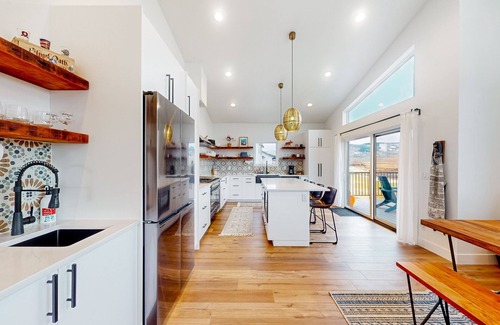 As you enter this charming home away from home, you will be greeted by a spacious open floor plan with high vaulted ceilings, exposed wood beams, and wall-to-wall windows allowing plenty of natural light inside. The beautifully decorated living room invites you to rest comfortably with your loved ones and relax. Turn on the gas fireplace and get ready for a cozy evening watching your favorite shows on the TV, playing board games, planning your adventures, or reading an entertaining novel from the tree-shaped bookshelf. The spacious chef's kitchen has been appointed with modern appliances that will make cooking a breeze. The main floor also grants you access to an extensive balcony with seating and impressive views of the mountains and Grand Elk Golf Club. The lower level houses a second living area with a TV and a vinyl record player with many records to choose from. Enjoy access to a private patio with a hammock where you can take a midday nap, read a favorite book, or listen to music with gorgeous vistas in front of you.