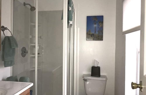 The main bathroom has skylight with full bath / shower / jacuzzi and space to store your toiletries. The large bedroom has a private bathroom with shower.
