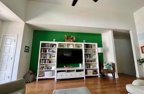 A spacious family room in basement is ready for you to spread out in a comfortable sectional and oversized chair and ottoman with a 55 inch flat screen smart TV equipped with streaming apps. Bonus game table with games, puzzles and toys allows for a big group to spread out in the great room.