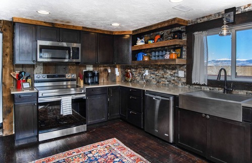 Guests have access to the modern and recently updated house, western village, saloon/game space, a large fenced in yard, and the ability to hike onto protected lands off this property! The ranch is ideal for family or event gatherings. The house has four bedrooms (queen: twin bunks: queen: full/two twins/twin trundle).