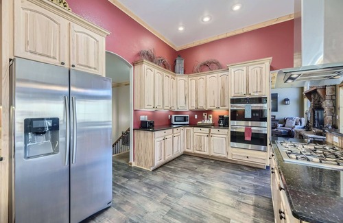This beautifully designed two-story retreat blends rustic charm with modern elegance. The bright and inviting kitchen, with warm red accents and stainless-steel appliances, opens to a scenic deck—perfect for morning coffee or evening gatherings. Relax in spacious living areas with large windows framing incredible mountain views, or cozy up by the indoor fireplace after a day of winter adventure.