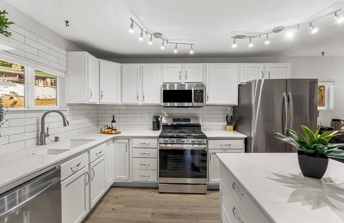 The fully stocked kitchen includes everything needed to prepare meals, from a refrigerator, stove, oven, and microwave to a dishwasher, coffee maker, and cooking basics. Wine glasses, a blender, and barbecue utensils are also provided, making it easy to enjoy anything from morning coffee to grilled dinners on the deck. Gather around the dining table to share meals and stories after a day outdoors.