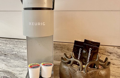 Fully equipped kitchen including Keurig coffee maker, utensils and cookware, microwave.