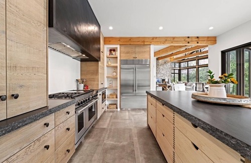 With soaring 30-foot windows, the Great Room showcases panoramic Amphitheater Caldera views and the town below—perfectly blending grandeur and serenity. Multiple seating areas invite you to relax, sip your favorite drink, play games, or watch a movie on the 85-inch Smart TV. In the evenings, curl up by the wood-burning fireplace and take in the awe-inspiring mountain scenery.