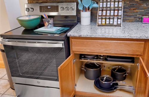 Fully equipped with high-end stainless steel appliances and luxury finishes, making it a perfect place to create gourmet meals with family and friends. Offering all needed cooking utensils and spices. There is a high chair, plates, bowls, utensils and cups for kiddos too.