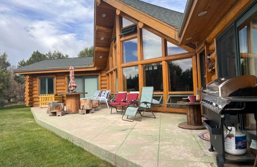 Built by respected log home builder - Larry Barnes - this wonderful Colorado custom log home enjoys peace and tranquility with majestic La Plata Mountain Views inside and out. Driving up to the house with its Silverton Eureka Rock driveway easily accommodates multiple cars and convenient in-and-out access. This great Colorado log home is located minutes to shopping/restaurants in Historic Downtown Durango as well as 3 major ski areas. Walk up the slate-tiled steps to the covered porch and enter this lovely home through the double glass doors. The home immediately opens to a huge western facing bay of windows in the living/dining room perfectly positioned to take in the grand mountain views. Located to the left of the entryway is the kitchen equipped with granite tile countertops, slate tile floors and stainless steel appliances. Birch cabinets and drawers filled with everything you will need to make your vacation feel like home. A breakfast bar for 3-4 people is made from a large piece of dimension lumber which further enriches the log home feel. A spiral staircase leads up to the loft area which looks out over the living/dining area and enjoys the same massive bay windows as the living room. This room has a queen futon. The living/dining room's high vaulted ceiling is complimented by solid log cross beams. A two-sided wood burning fireplace with river rock surround offers the romantic ambiance of an evening fire to both the living room and the master suite. An elk antler chandelier overhanging the dining area adds a touch of Colorado flair. The master suite has its own patio access and a master bathroom that will surely satisfy. An oversized Jacuzzi bathtub sits in the corner of the master bedroom supported by a travertine surround. Relax in a warm jet bath! The bathroom also has a walk-in shower with travertine tile and dual sinks with stylish oval vanity mirrors. Don't forget about the dual-sided fireplace to keep you warm on those colder evenings!