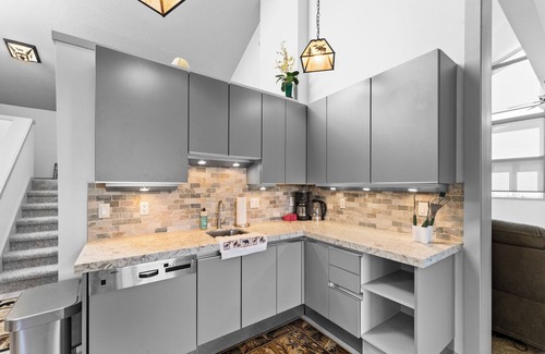 Downstairs from the kitchen, you'll find two additional bedrooms. One features a cozy queen bed and an en-suite bathroom with a single sink vanity and a combination shower and tub. The other is a fun kids' room, complete with two twin-over-twin bunk beds, twin trundles, and plenty of toys to keep the little ones entertained. Both bedrooms come with their own TVs, ensuring everyone can unwind with their favorite shows. Next to the kids' room is a private laundry area, equipped with a washer, dryer, sink, and microwave for quick snacks.
