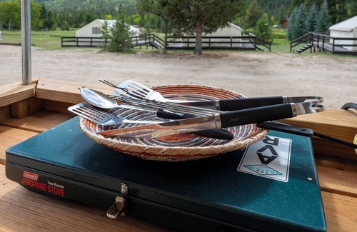 Designed to comfortably accommodate two adults and two children, the tent is furnished with a queen bed, a full futon, a battery bank for charging phones and small devices, a wood-burning stove, a cooler for food and drinks, a table and chairs for four, and a fully equipped camp kitchen. The kitchen includes plates, bowls, mugs, and silverware for four, a two-burner propane camping stove, a 10" pan, two pots, a kettle, a French press, and cooking utensils.
