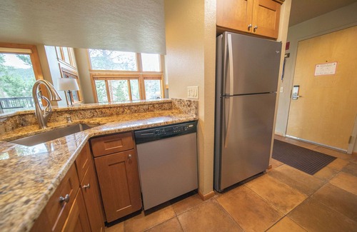 Quicksilver 1635 features a cozy gas fireplace to warm up after your adventures, complemented by large windows that bathe the space in natural light. The casual dining area comfortably seats six, with additional seating at the breakfast bar. The kitchen, equipped with modern appliances, granite countertops, and ample cabinet space, is a dream for any chef. Whether you're preparing a quick breakfast before hitting the slopes or a gourmet dinner, you'll have everything you need. The breakfast bar is perfect for casual dining or sipping coffee while planning your day. Step out onto the private balcony to enjoy breathtaking views and fresh mountain air, ideal for your morning coffee or an evening drink.