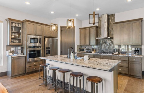 The top and main floors both have a full, private master suite with king beds. The walk-out lower floor has 2 queen bedrooms and an open bunk area that sleeps 4. Every floor has a large common area with massive west-facing windows and decks that look out onto the slopes. The entire home has been tastefully furnished and appointed! Attention has been given to every detail of this gorgeous house. This is your home if you want to get the true mountain feel with a luxurious touch. They'll be no mistaking that you are on vacation when you stay here.