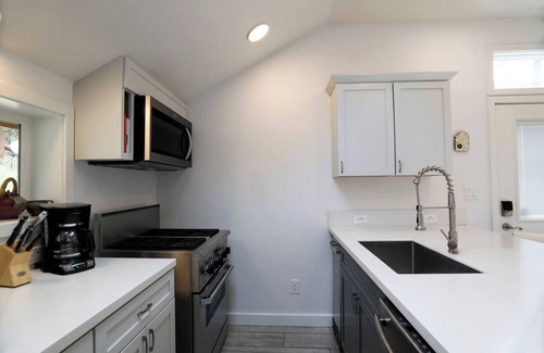 Unwind and explore at Evergreen’s most unique getaway. Conveniently located within walking distance of Tall Grass spa, and a short 10 minute drive down breathtaking Upper Bear Creek Road to Evergreen lake and Downtown Evergreen shops and dining. NEW $30k+ stone backyard patio w/ giant waterfall, stream with stone walkway and wooden bridge, wood fired sauna, tanning patio, lounge chairs, umbrella, BBQ grill and hammock. Private filtered well water, tons of furry visitors! As featured on Tiny House Talk! Main bedroom with a new queen foam mattress, a 2nd bedroom with a desk and rolling chair, 2 dressers and 2 closets. Full size kitchen with dishes, pots and pans, fridge, gas oven, tv with Netflix, and sitting porch. Outdoor rocking bench and chairs.
